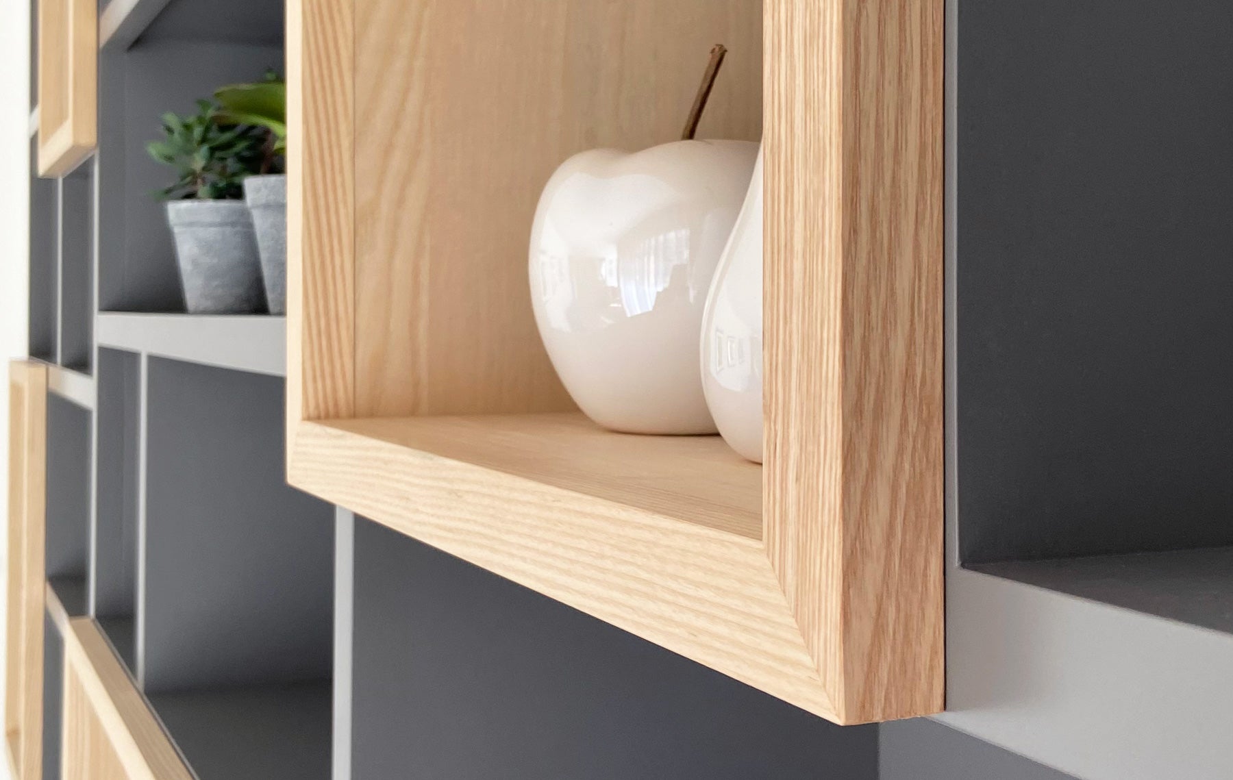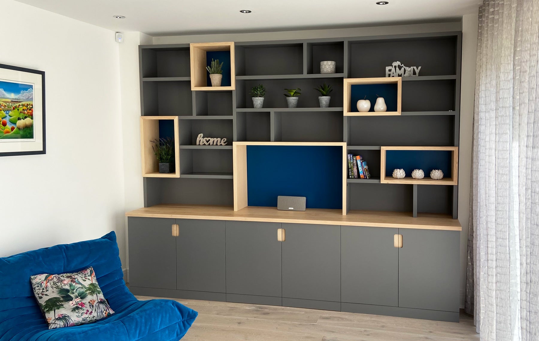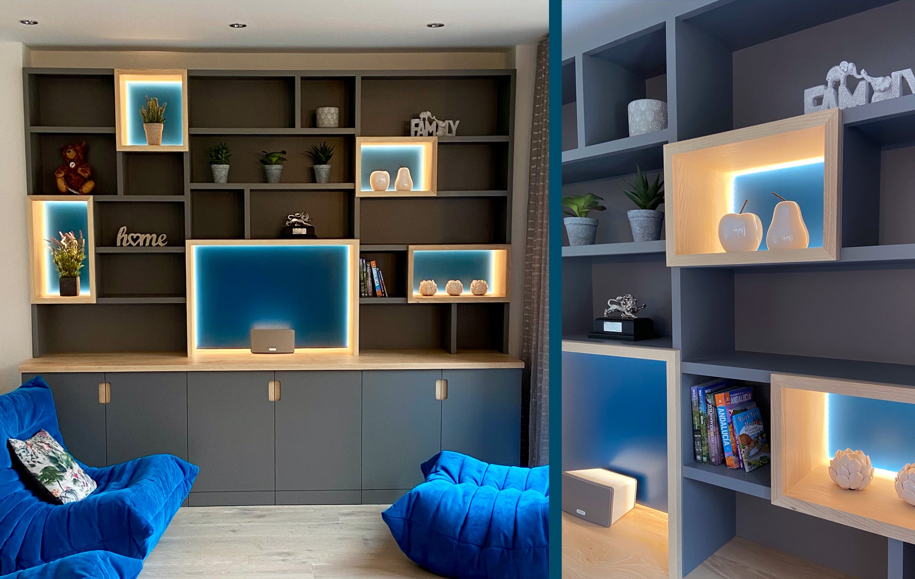 Solid ash boxes with vibrant blue provide a wonderful contrast to the strong grey of the shelves and cabinets. All five conceal LED lighting, effectively turning a daytime office into an evening snug with the flick of a switch.