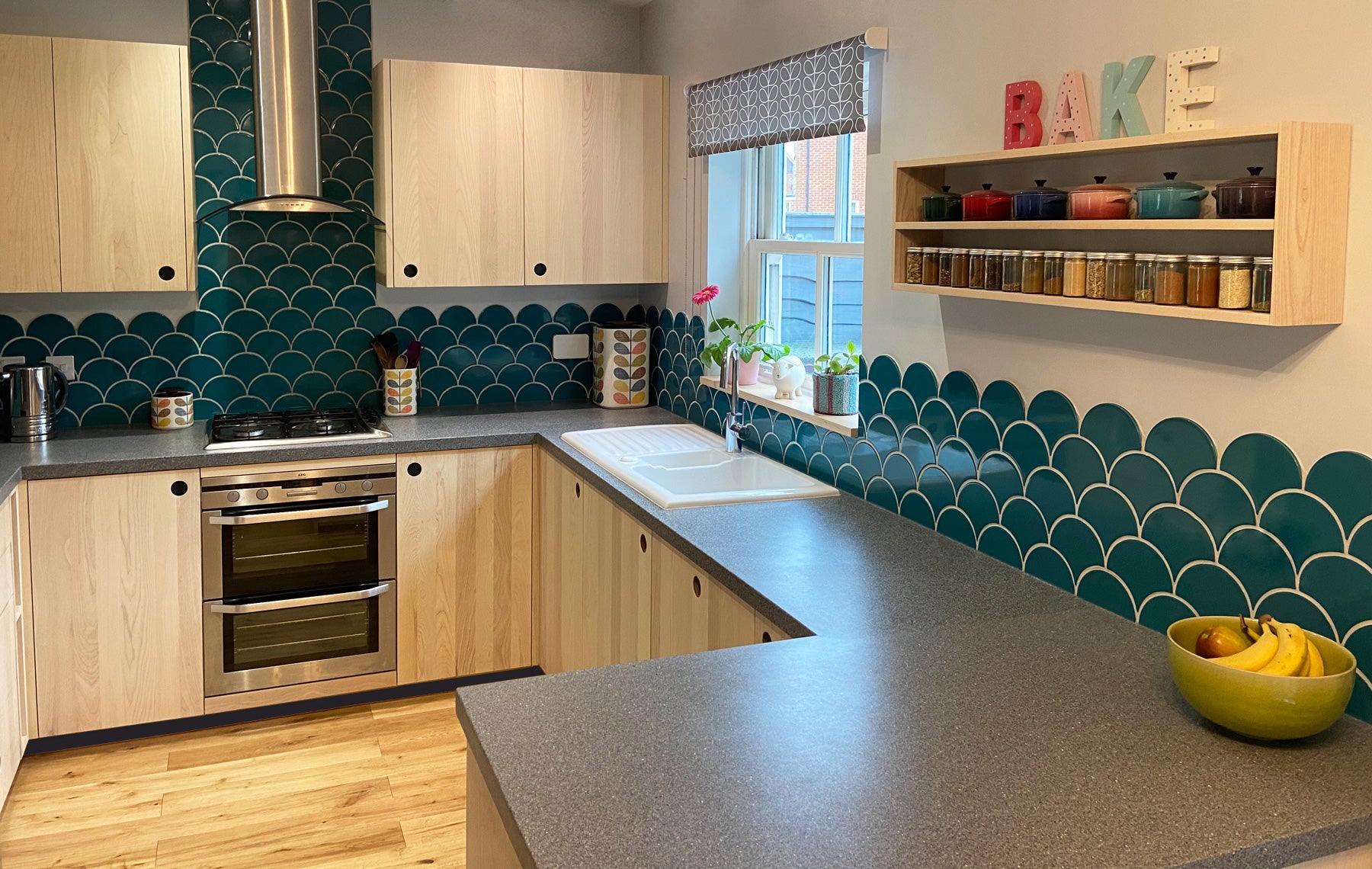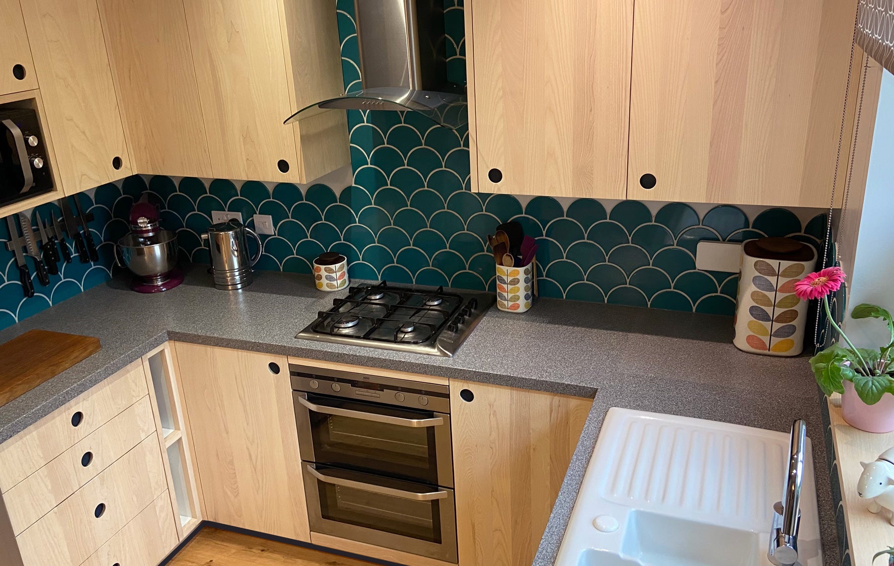 In order to maximise storage in a limited space every cabinet has been custom made and the location of each appliance carefully considered. The microwave in a wall cabinet to free up worktop and the washing machine concealed beneath the peninsula unit. With no obvious space for freestanding bins, they too are integrated within a bespoke pull out.