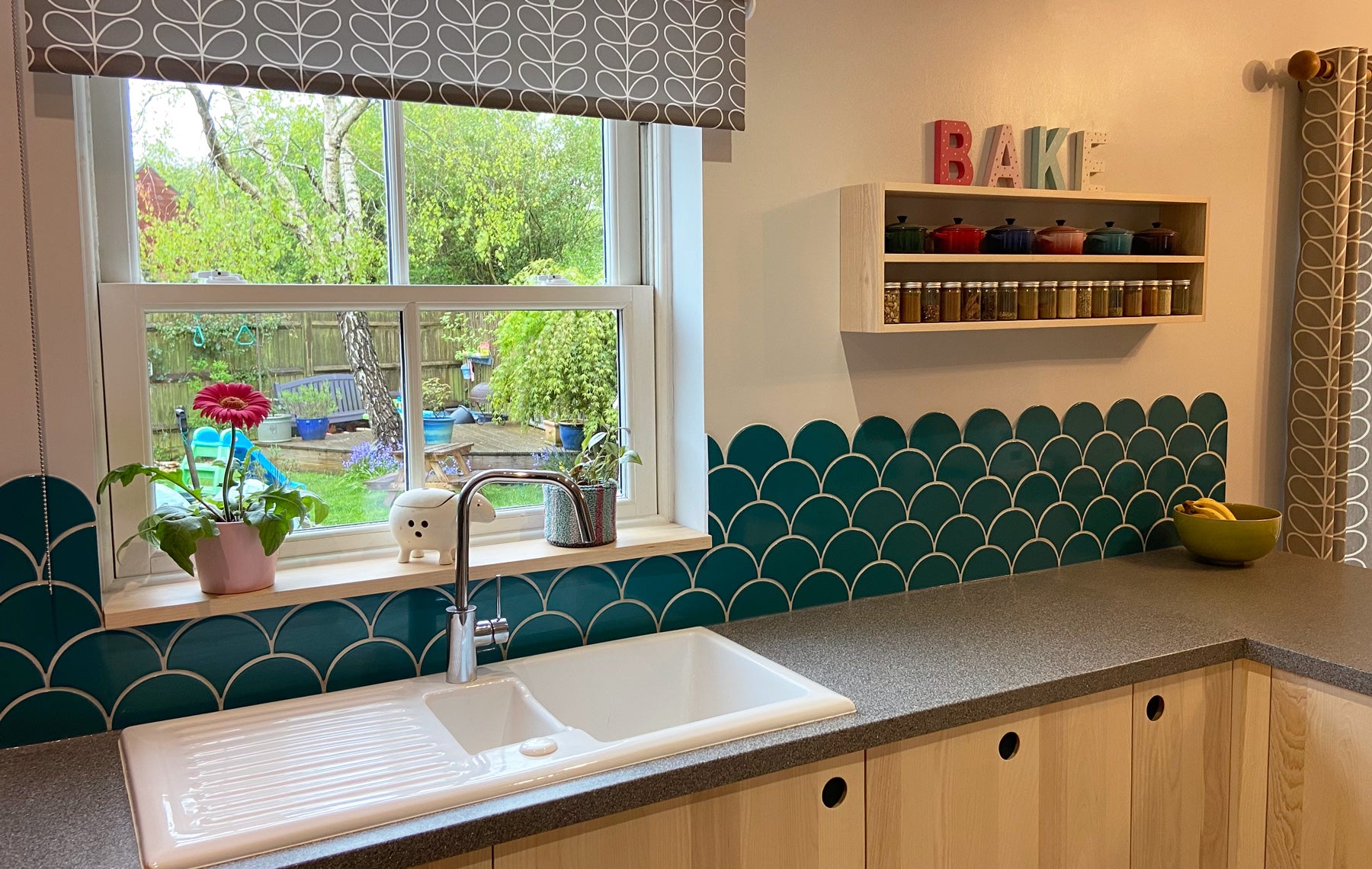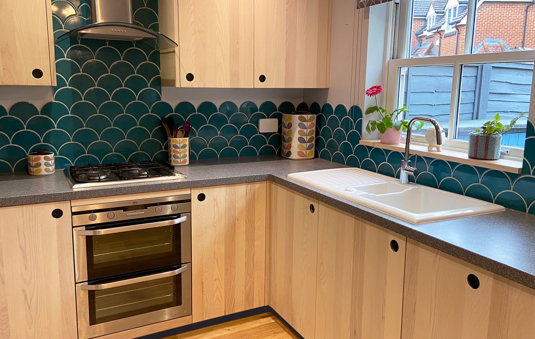 The doors are made from solid ash and finished with a white osmo. Recessed handles offer glimpses of navy Forbo, echoed in the plinth below. The ‘Lava’ worktop is Maia solid surface.