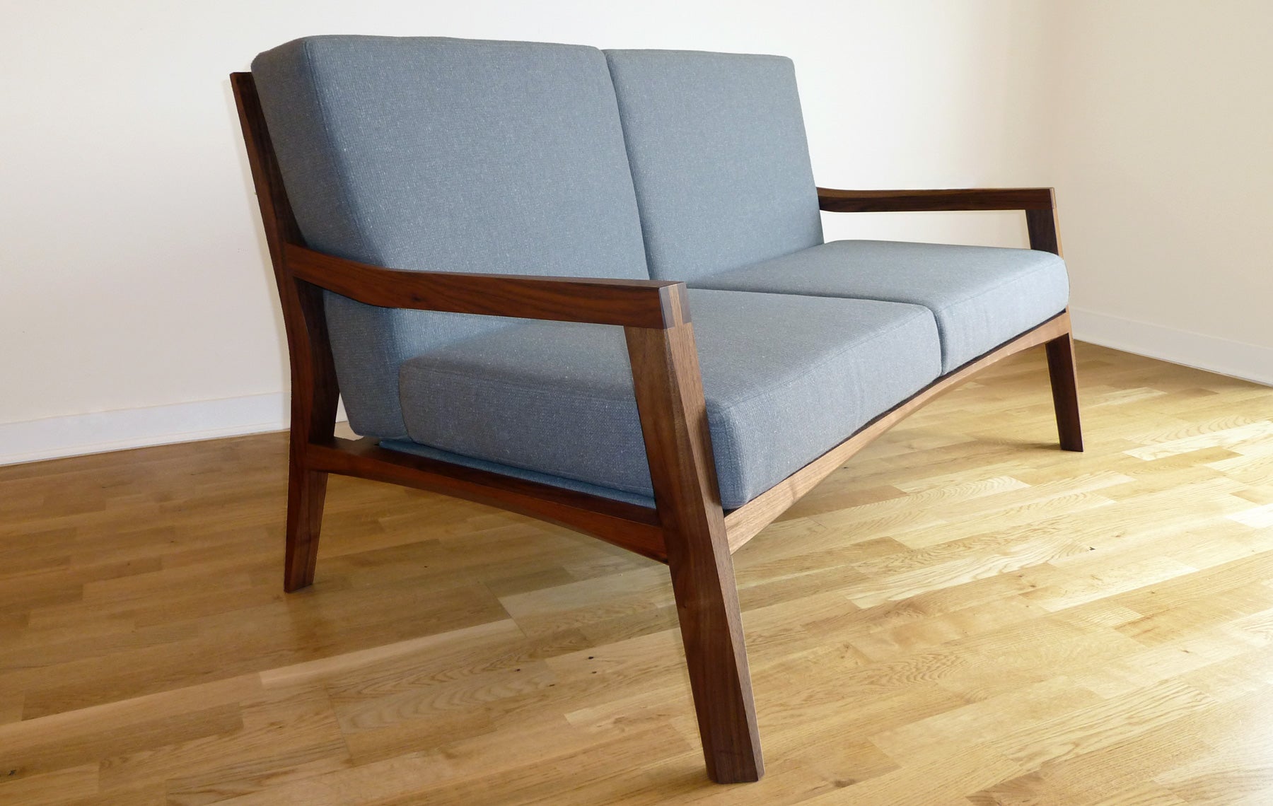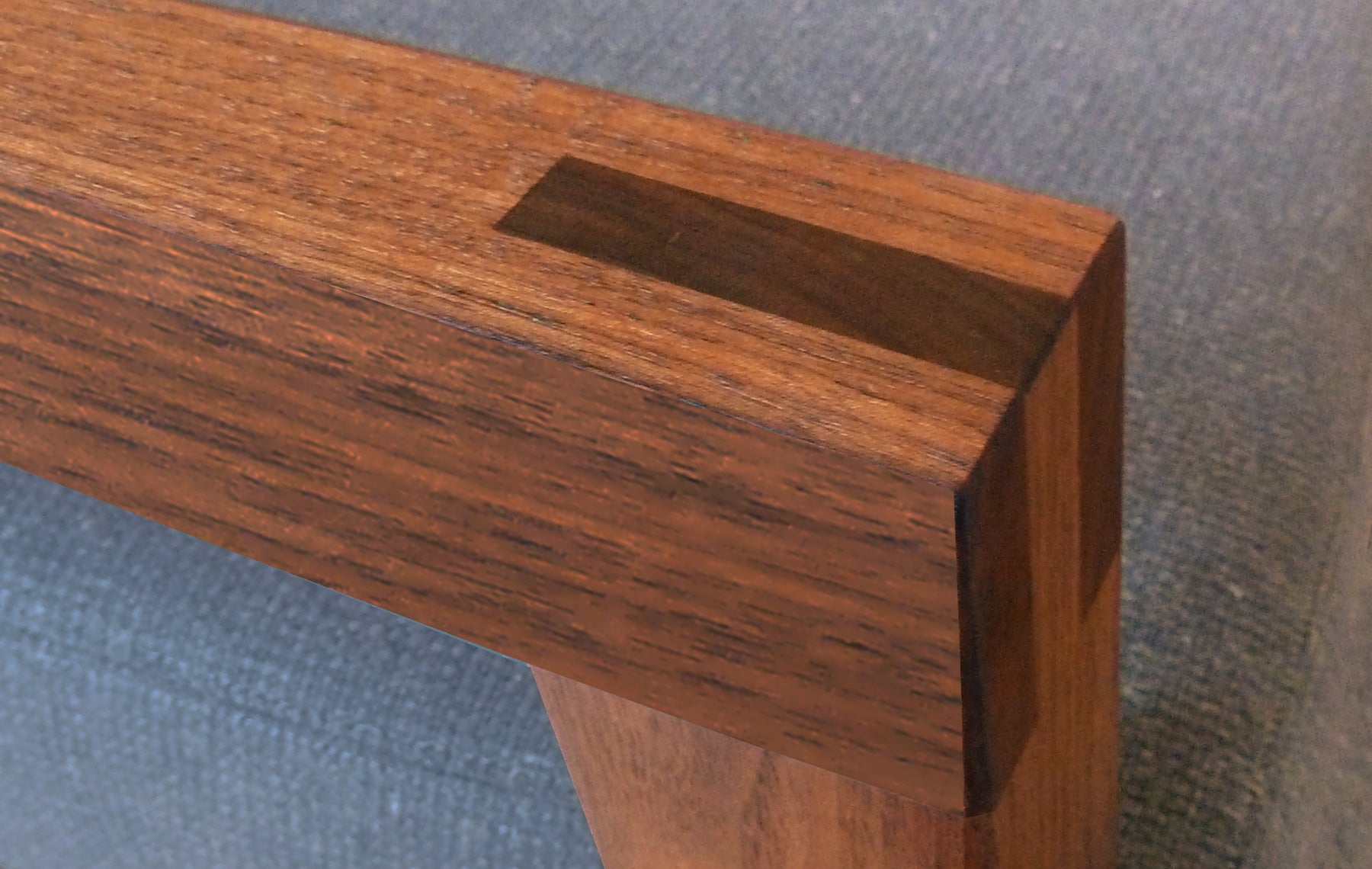The scalloped rails were shaped using a traditional spokeshave, while the bridal joint was cut by hand. The cushions were upholstered in sustainable nettle fabric.