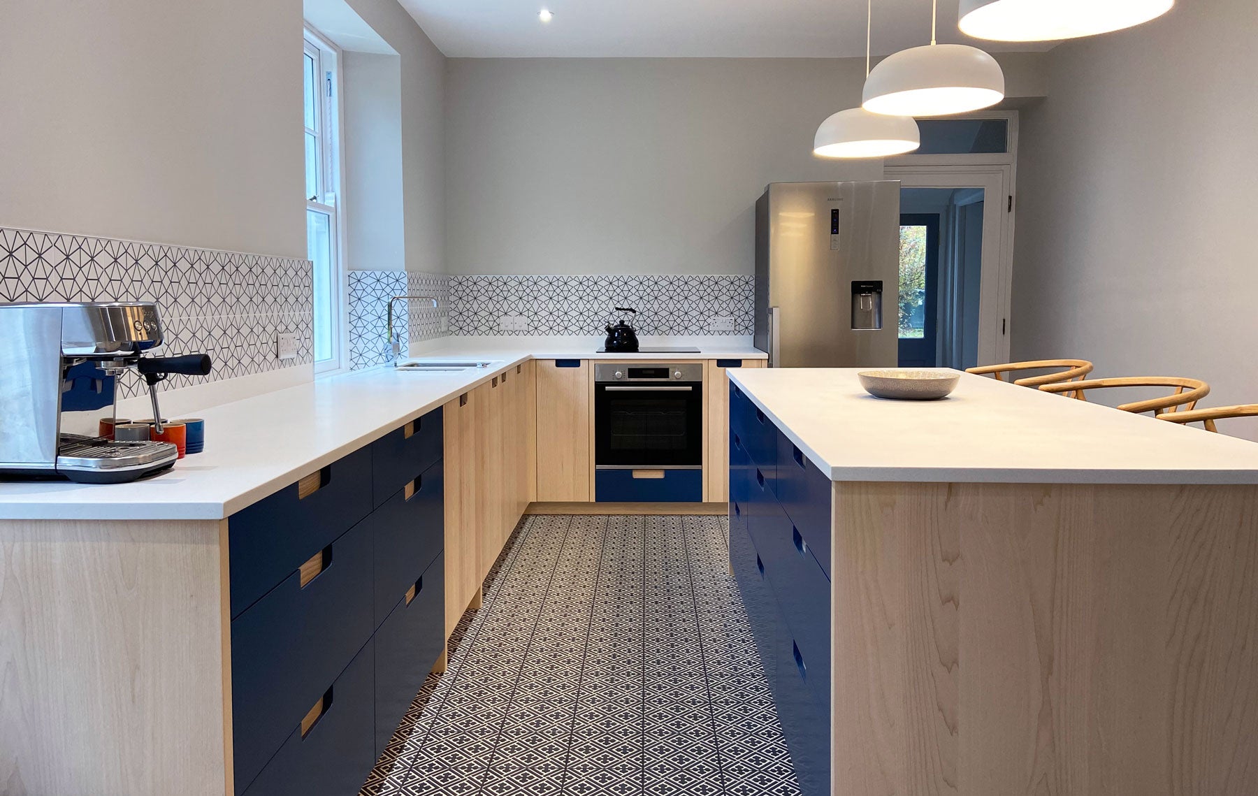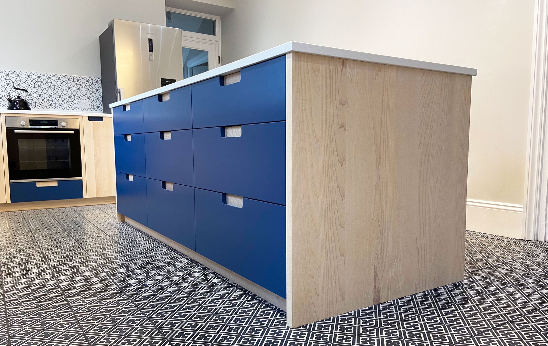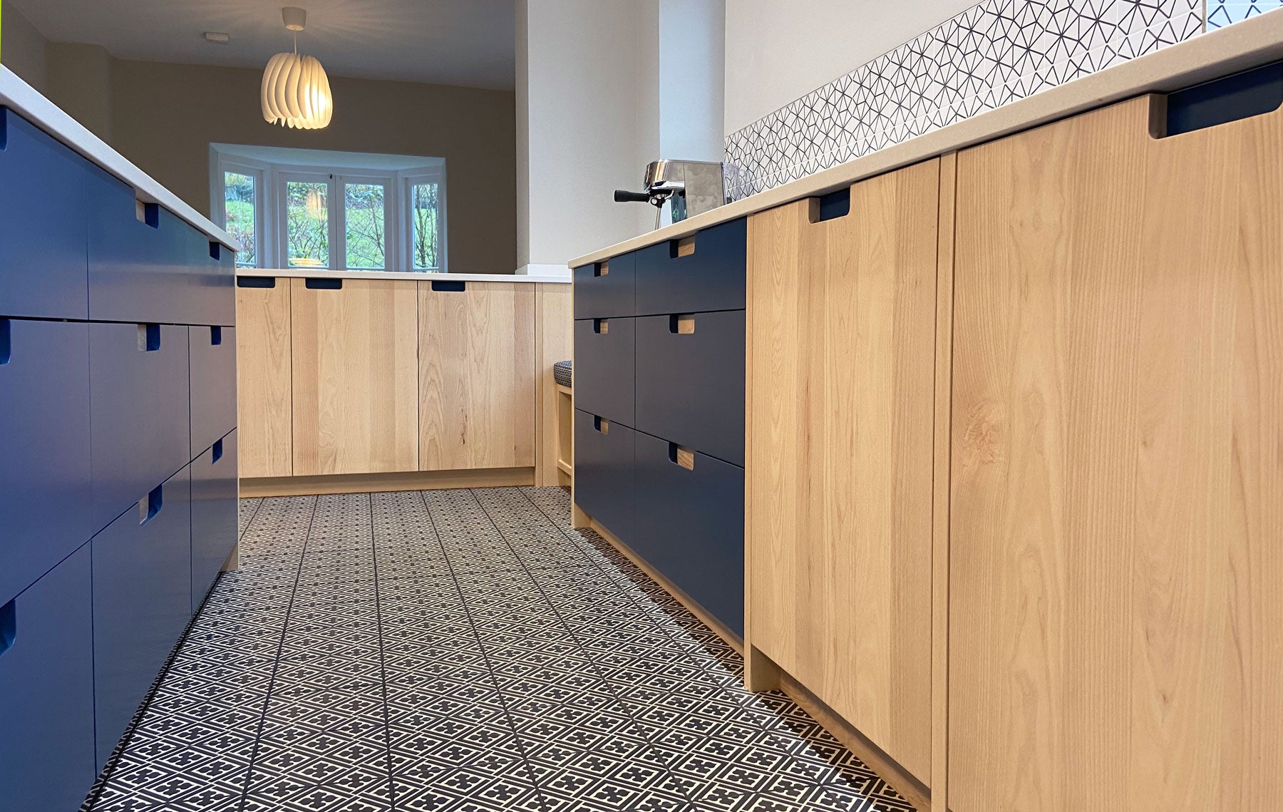 White ash doors and woad blue drawer fronts with contrasting recessed handles. The white flecked Maia worktops provide a durable surface with seamless joints.