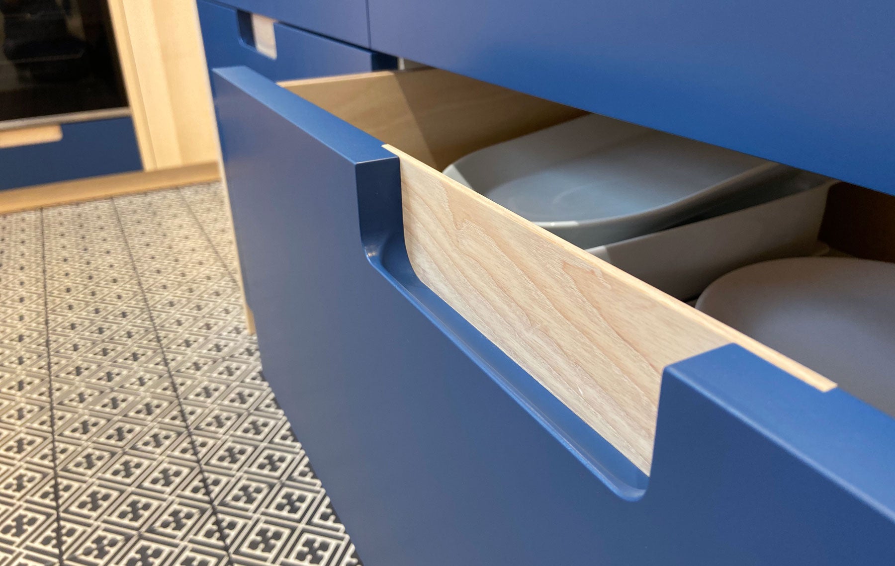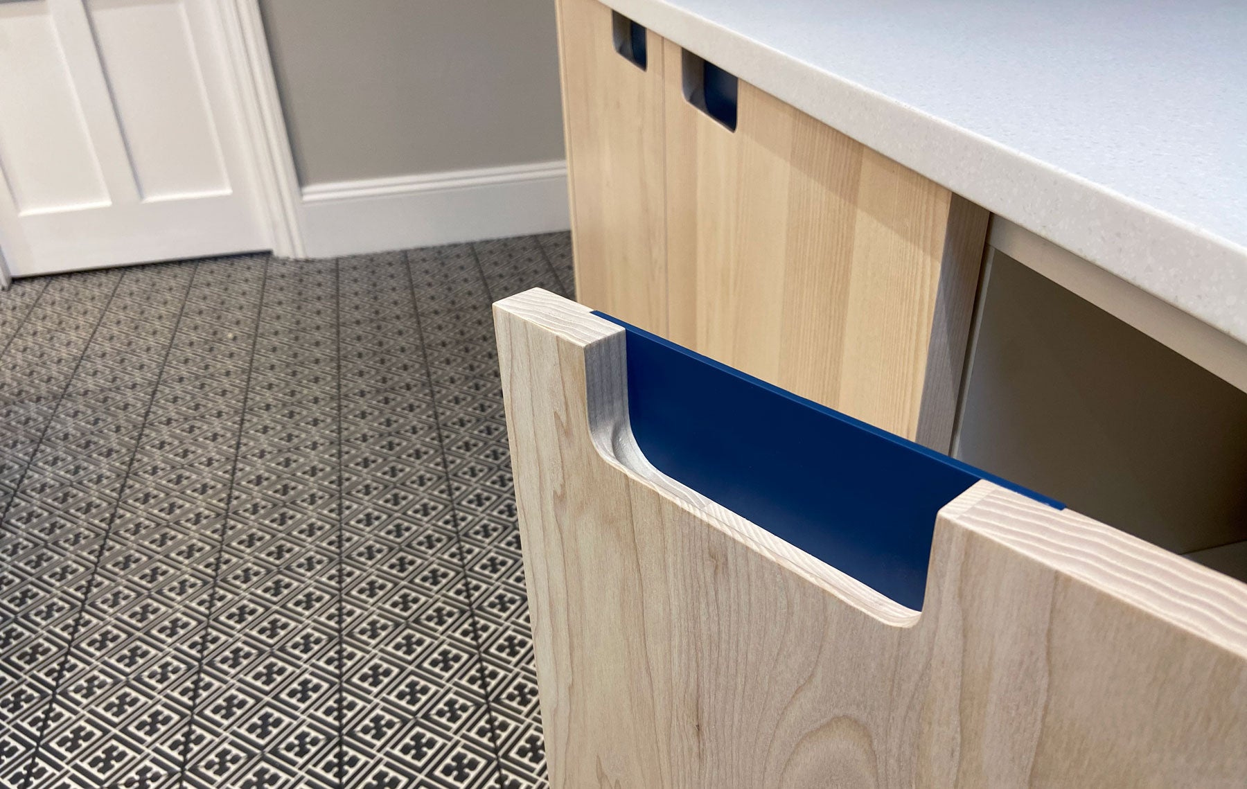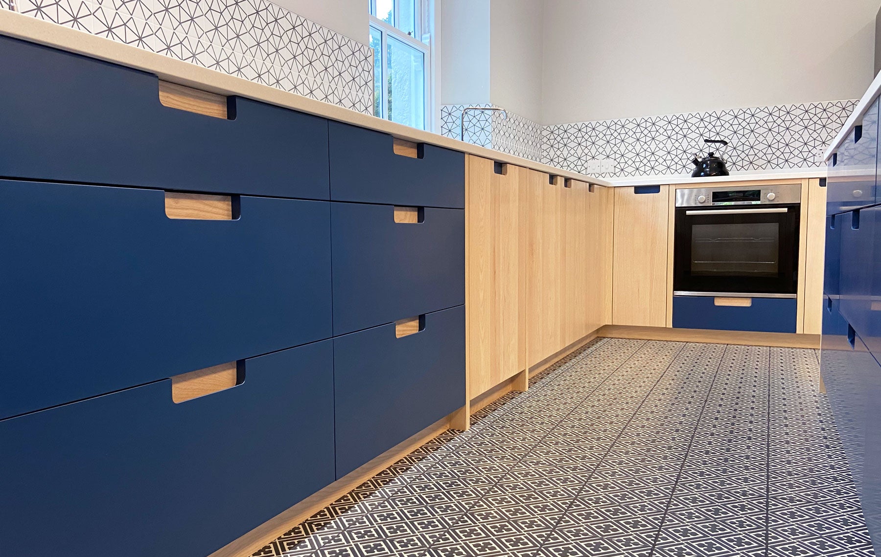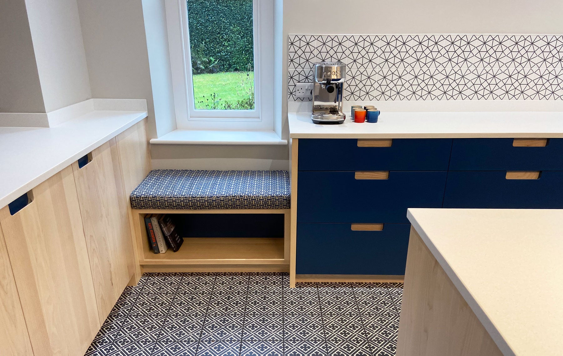 White ash doors and woad blue drawer fronts with contrasting recessed handles. The white flecked Maia worktops provide a durable surface with seamless joints.