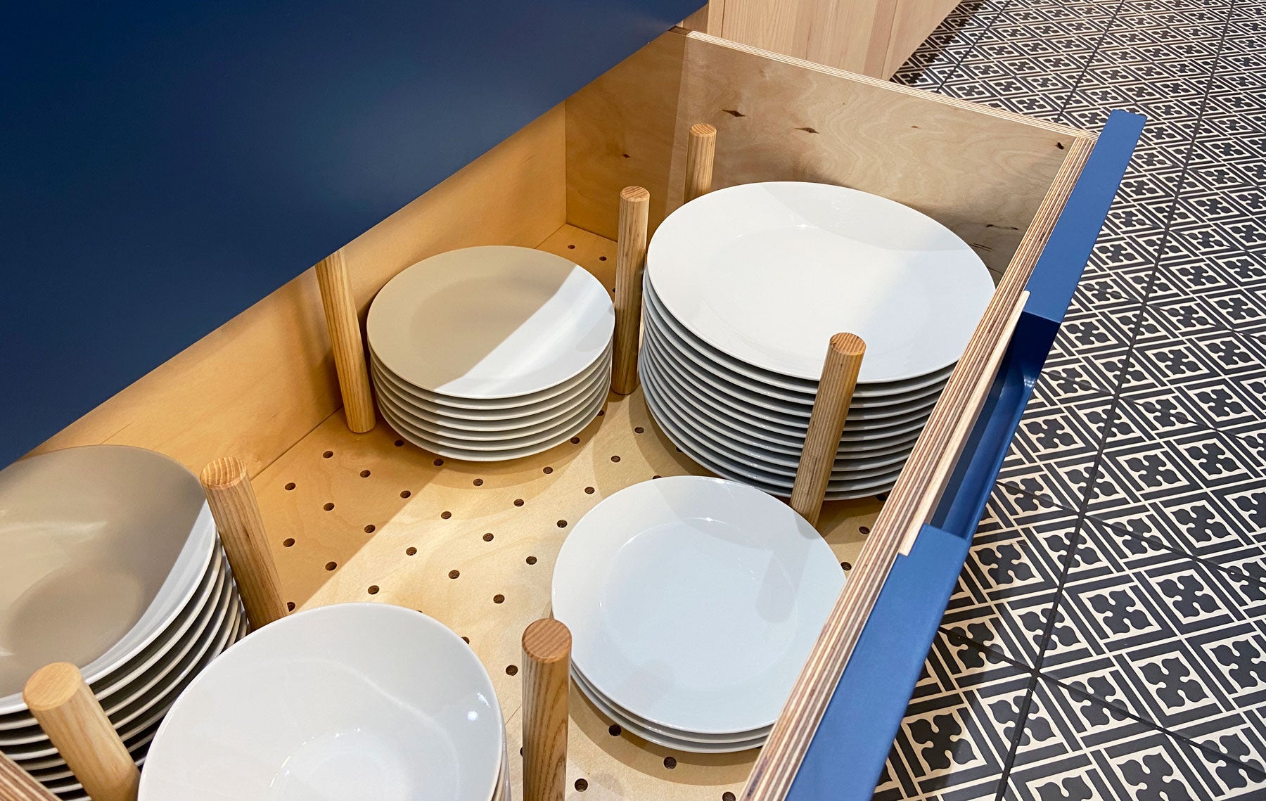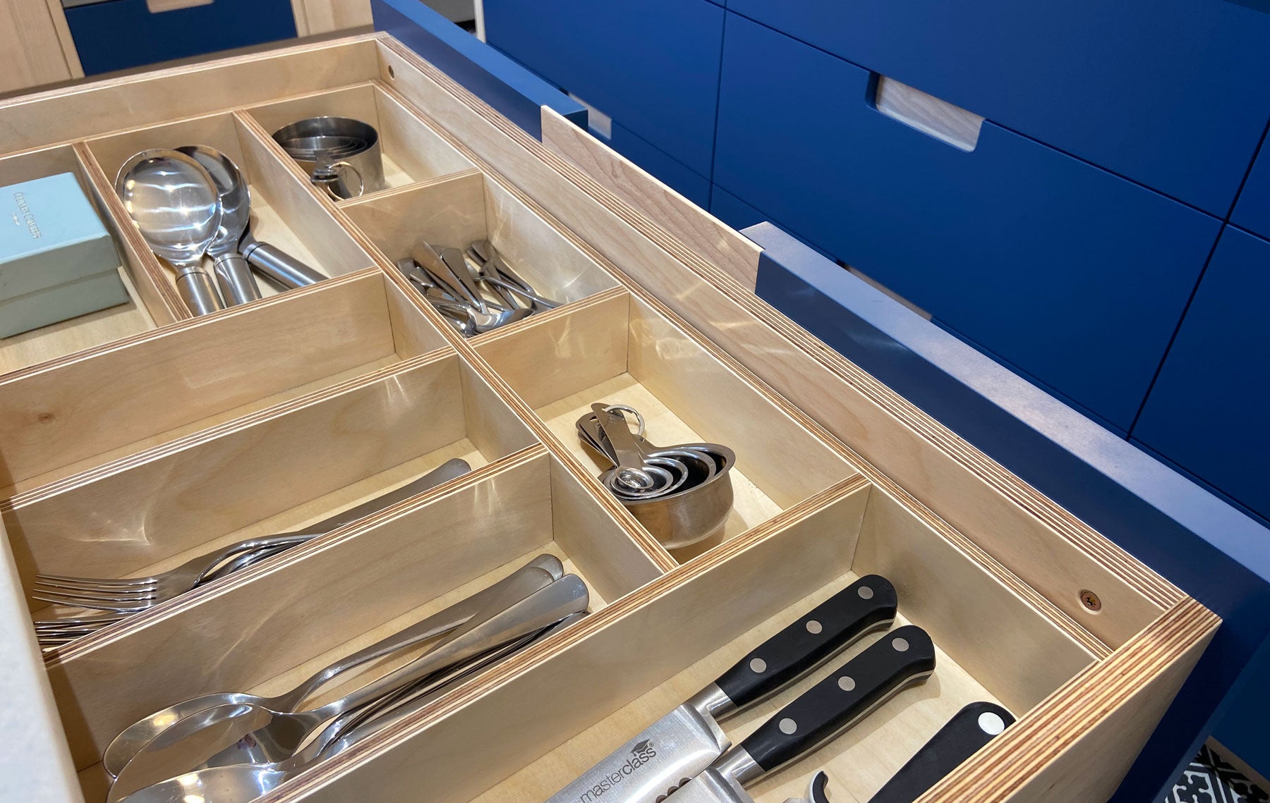 Bespoke utensil trays and peg boards ensure every item has it's place within birch plywood drawers on soft close runners.
