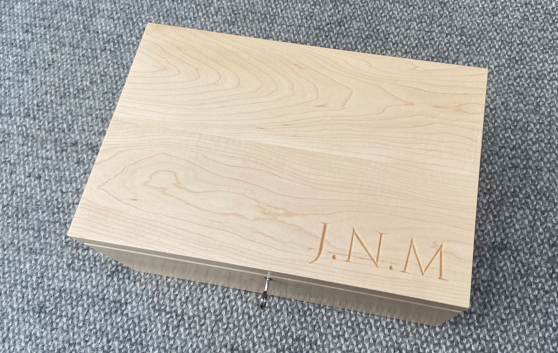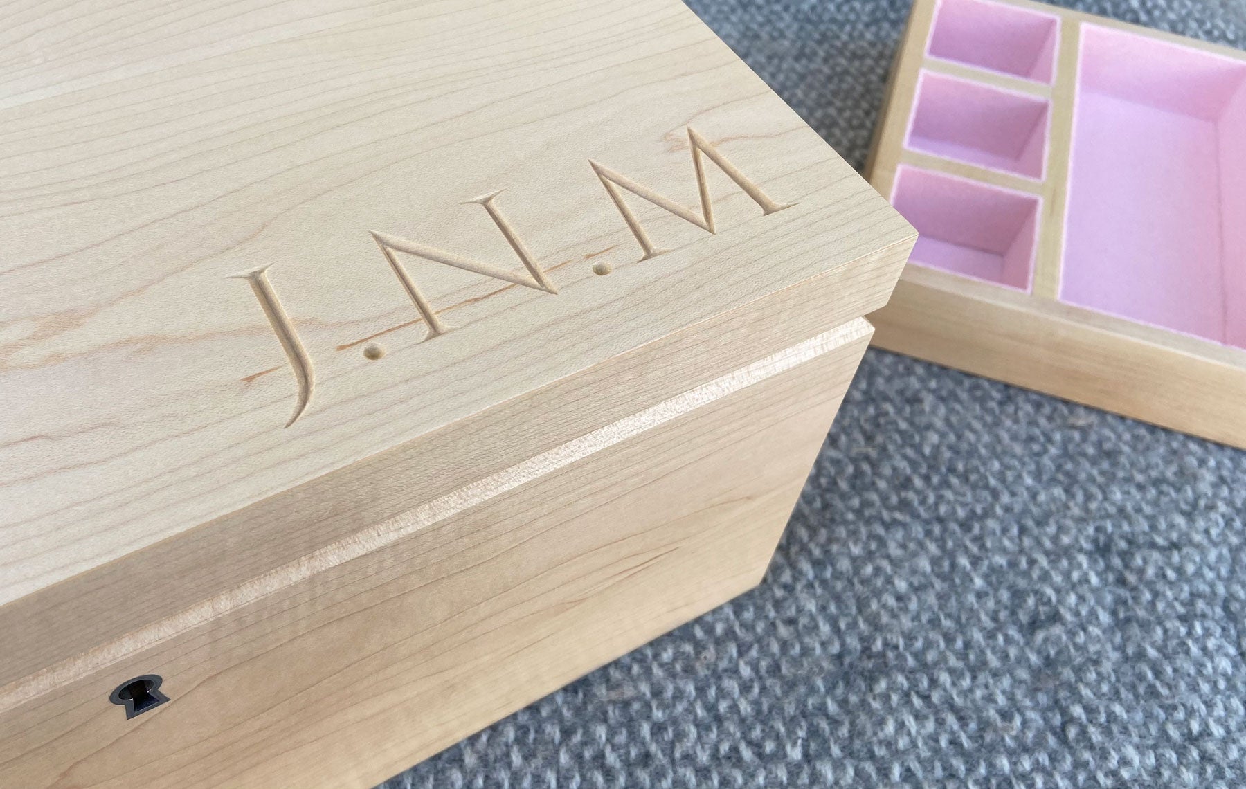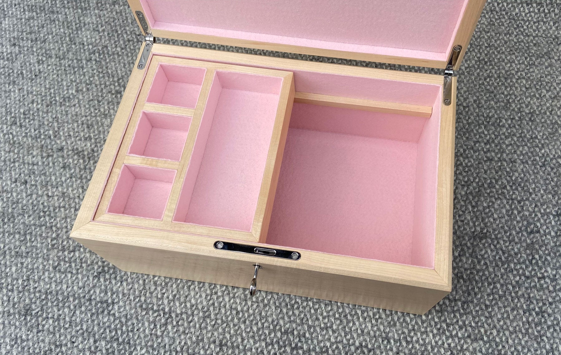 Upon planing the maple that this box is crafted from, a subtle ripple was revealed running across the grain, making it perfect for the project. The interior reveals precision engineered stainless steel hardware and pale pink felt lining.