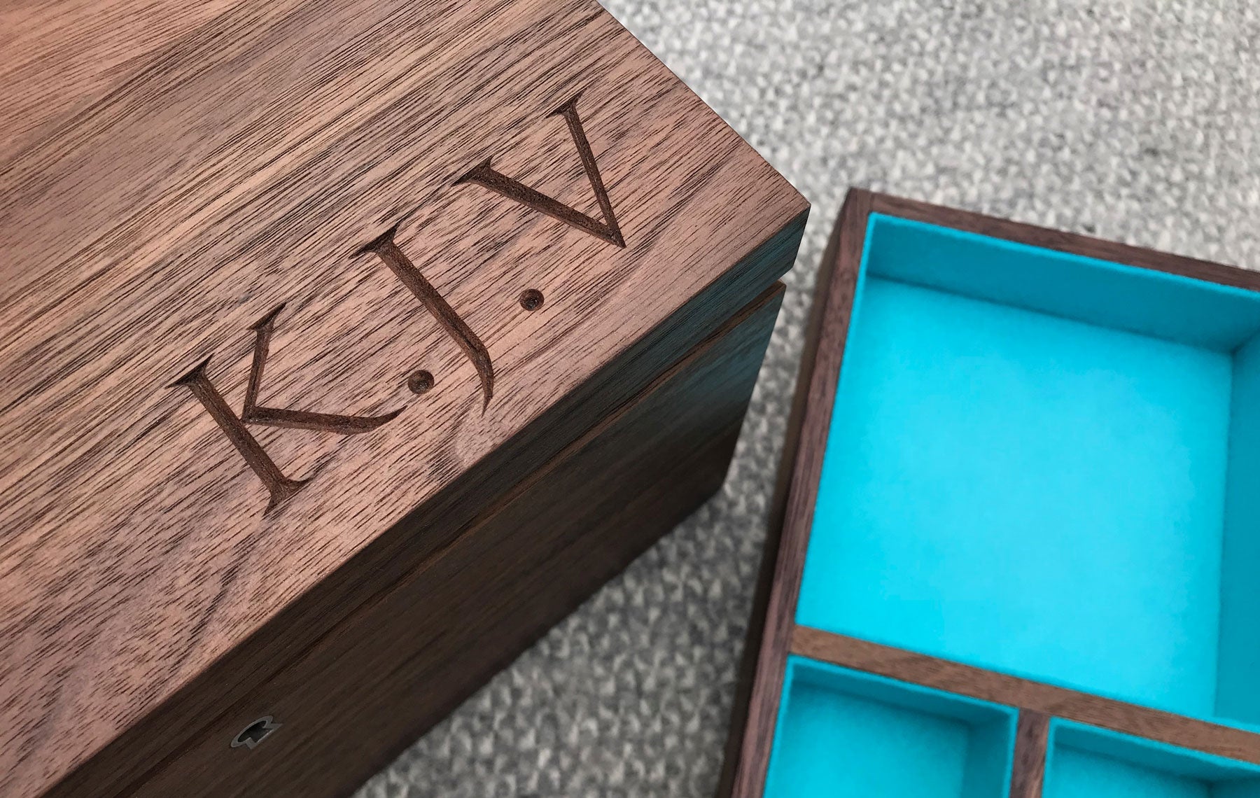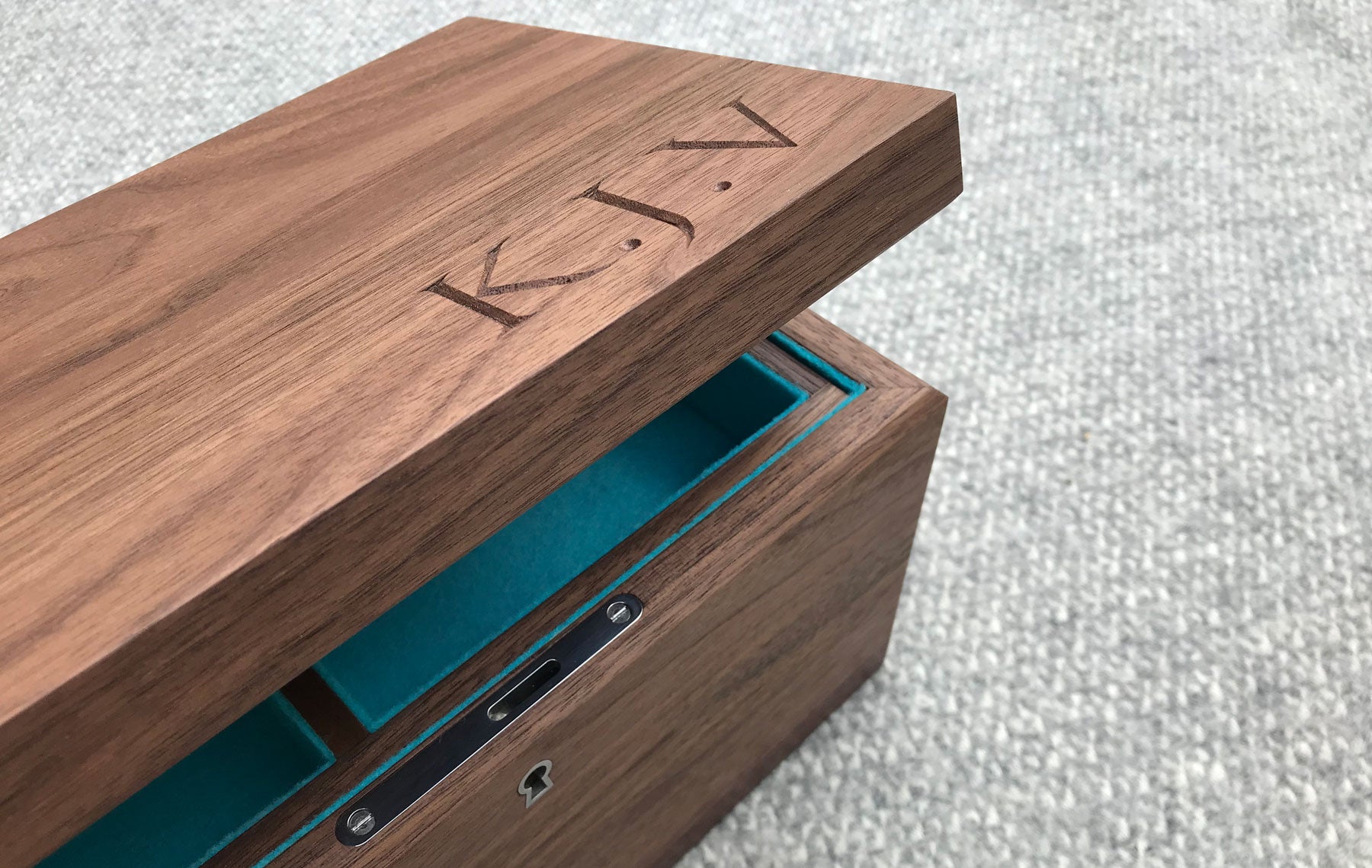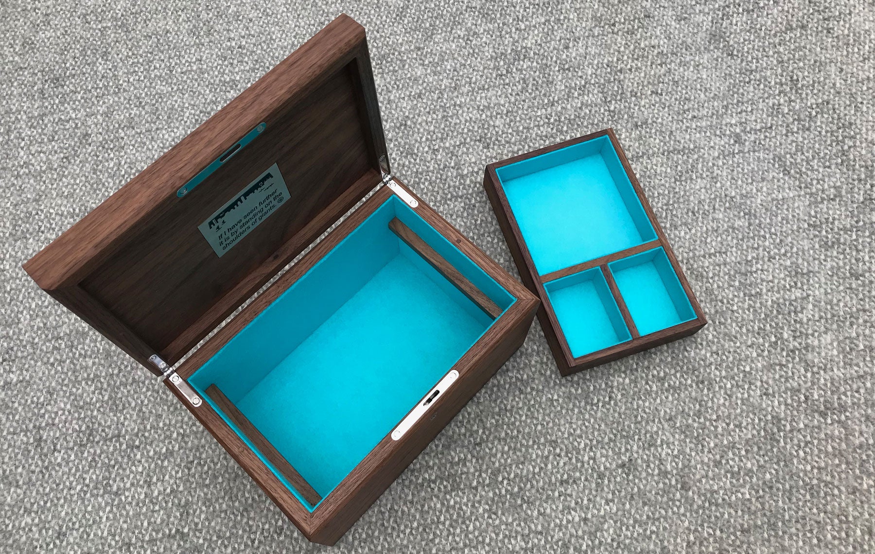 Made in the shape and style of our signature design, this walnut box has a few elegant upgrades. It is fitted with expertly crafted stainless steel hinges and matching lock from ‘Fine Box Hardware’ and reveals a plaque etched with a famous quotation, significant to the recipient.