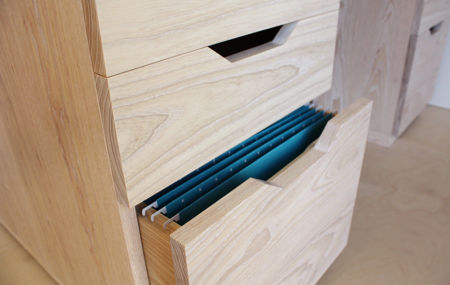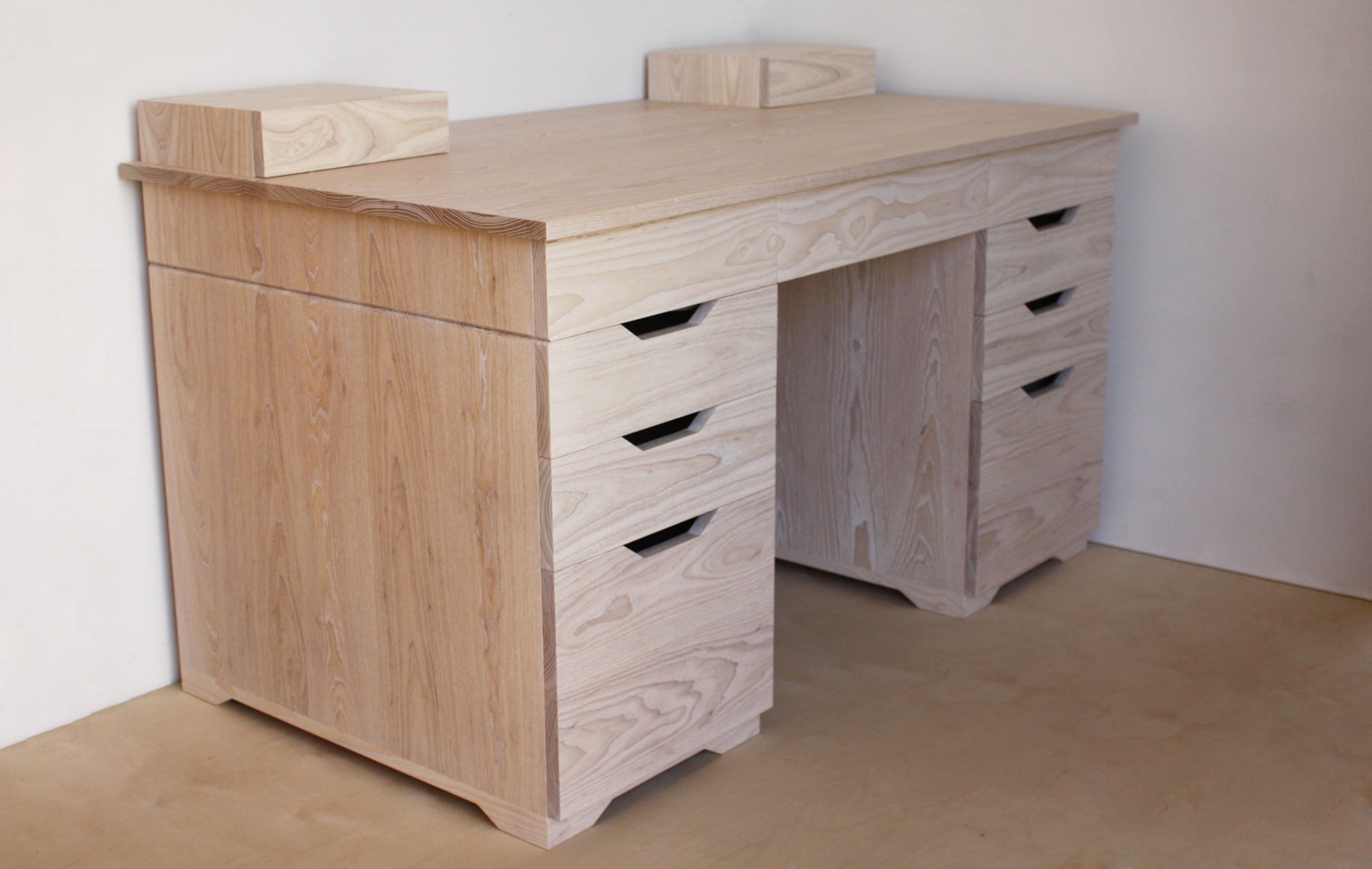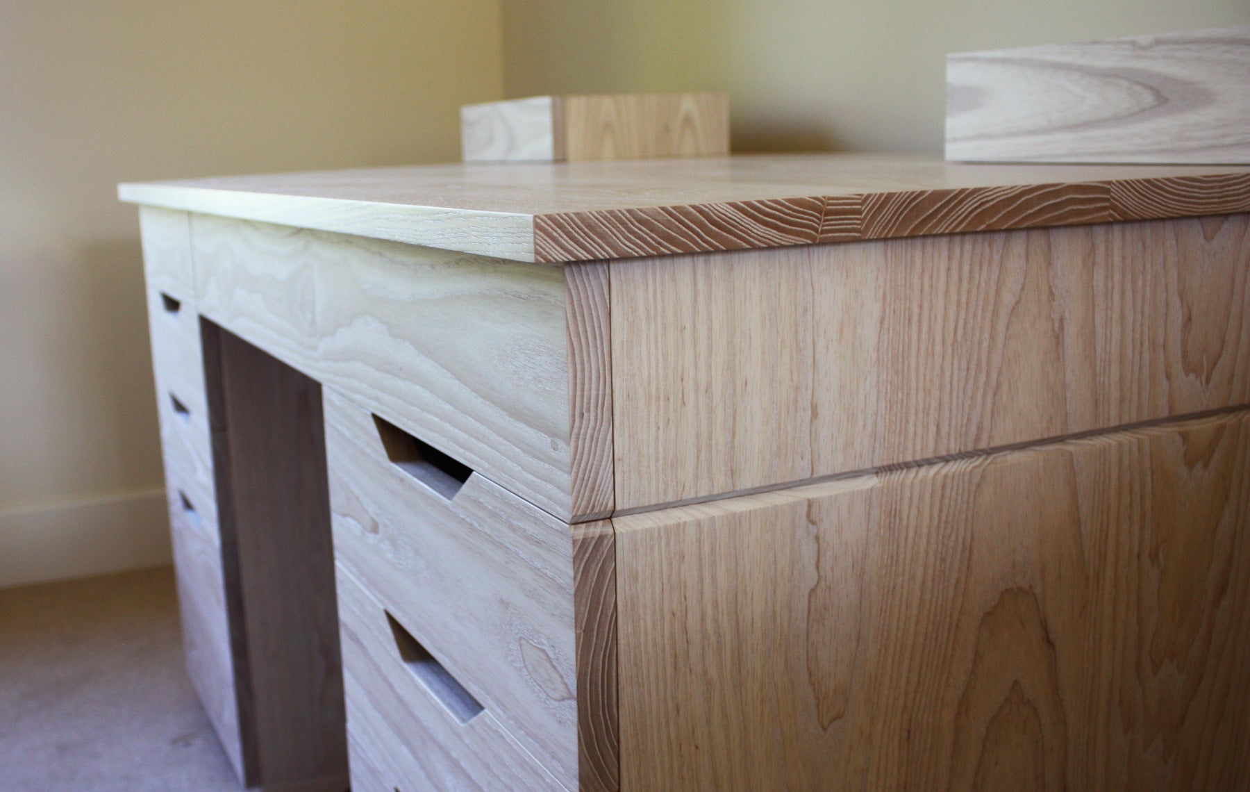 The brief for this desk had a strong emphasis on storage, hence the many drawers. The sides of each one are grooved and slide on wooden runners. Made entirely from solid ash, it is finished with a white oil accentuating the patterned grain.