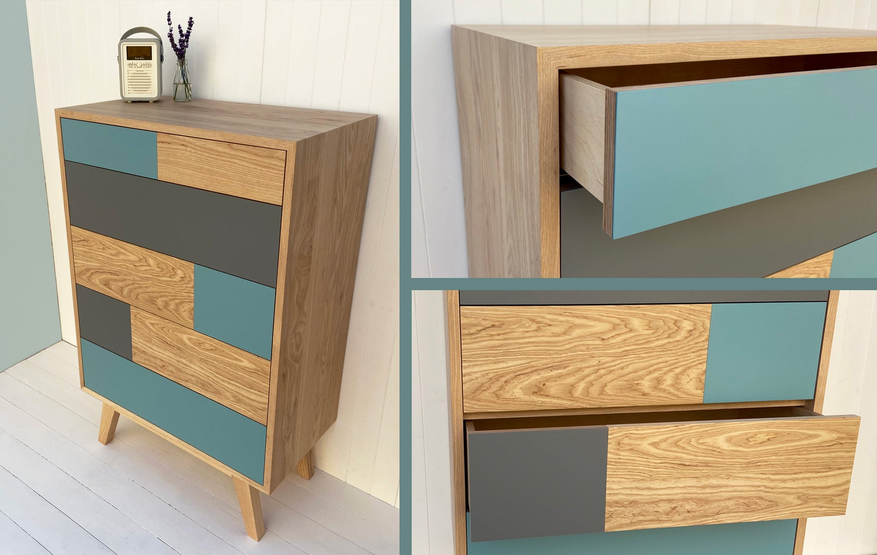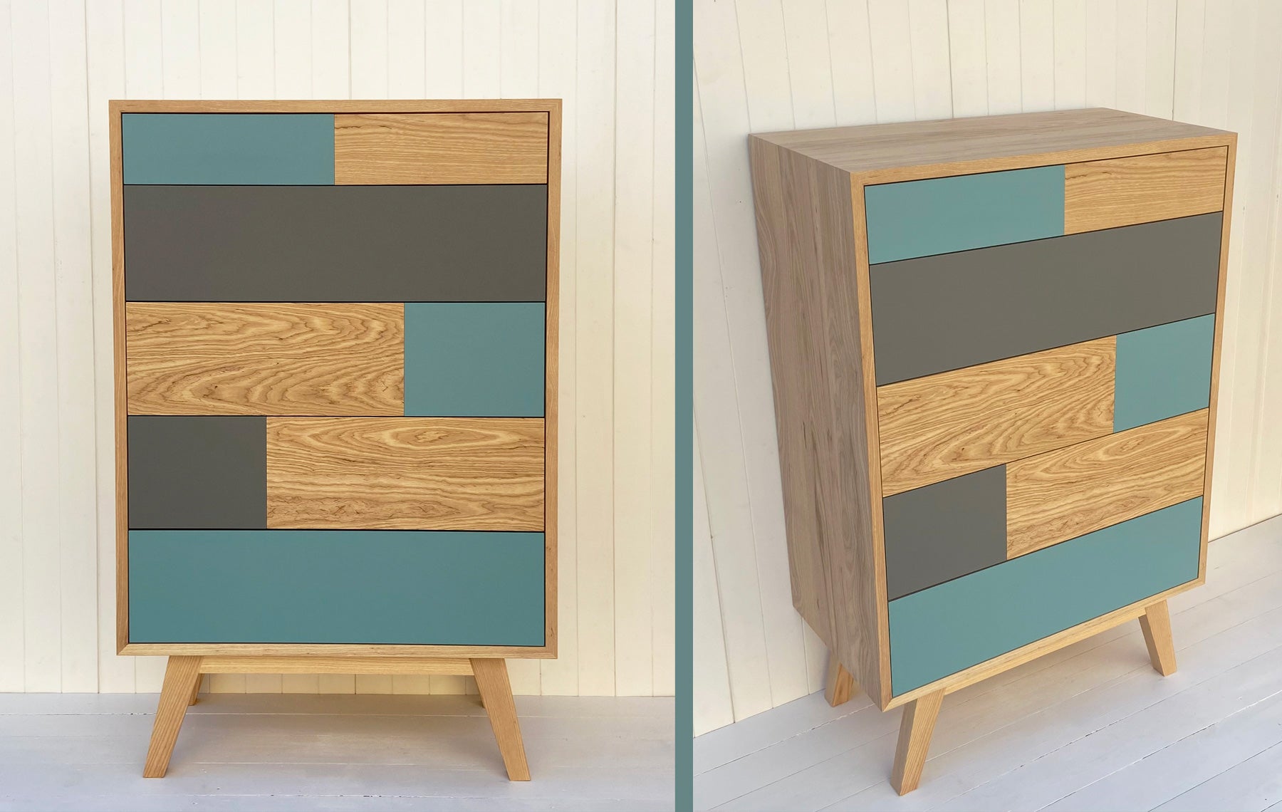 Aqua and grey compliment pale ash blocks and form a geometric stack across the front of this chest of drawers.