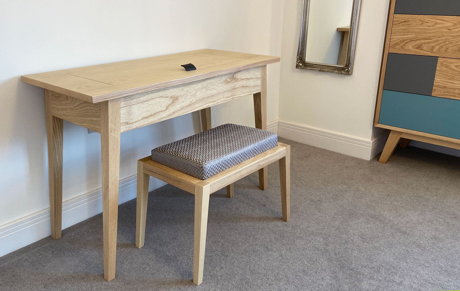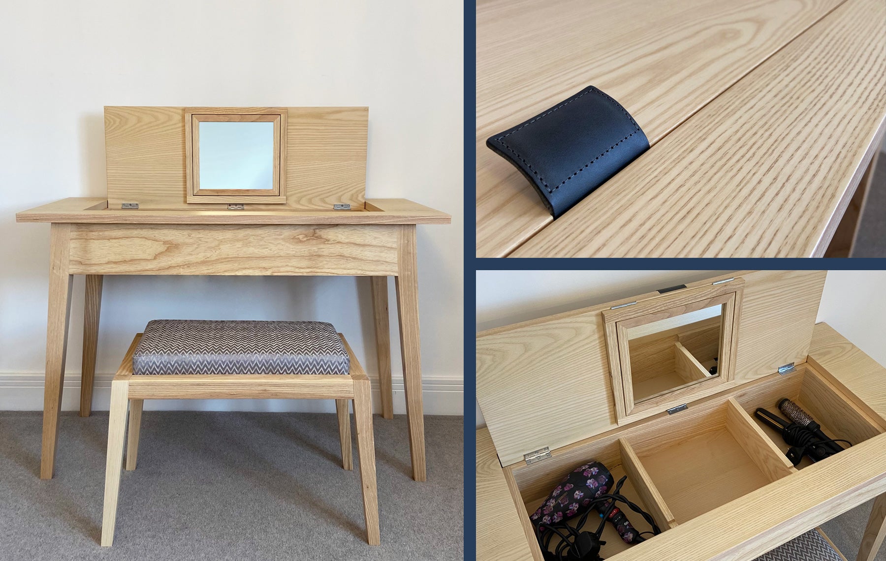 Strongly inspired by our oak dressing table, this piece is made from ash to match the serene collection. The table legs are splayed, as are those of the accompanying stool.