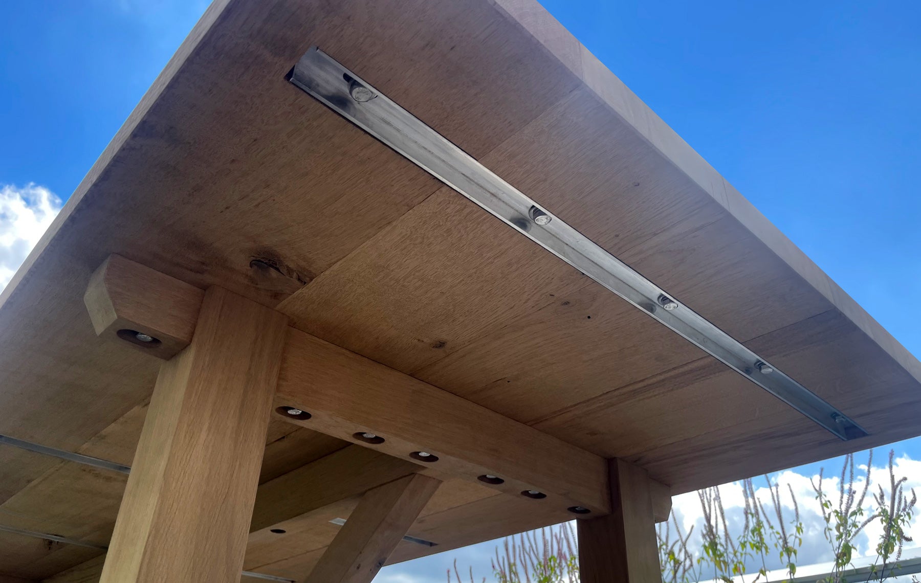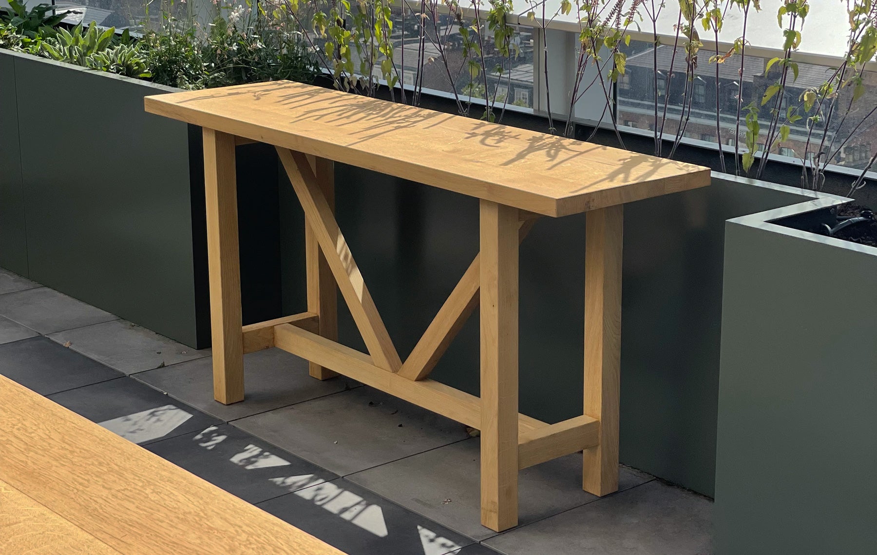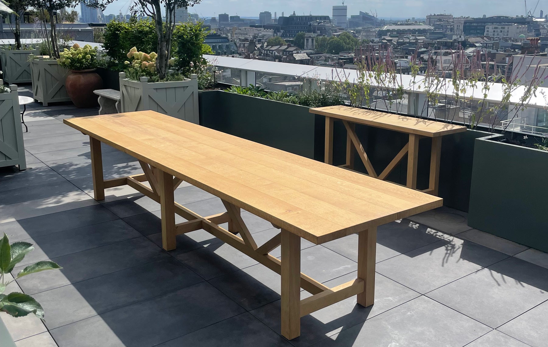 Part of a wider landscaping project on the top floor terrace of a London office building, these tables are made from air dried oak. Bespoke stainless metal work is recessed into the underside of each top to help keep them flat throughout the seasons.