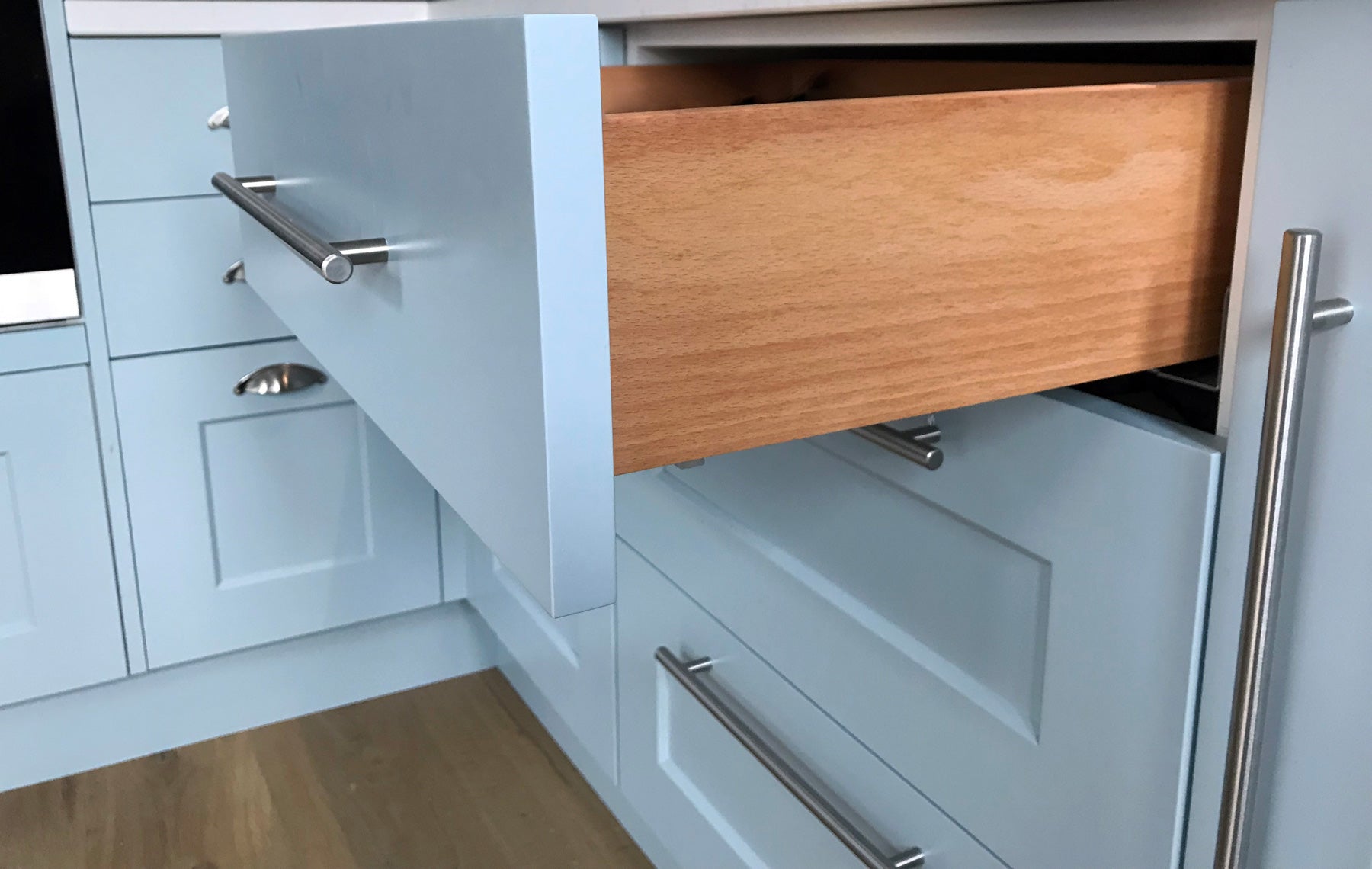 As with all of our kitchens every cabinet was made to measure to utilise every ounce of storage space. Full depth solid beech drawers were fitted with high quality soft close runners.