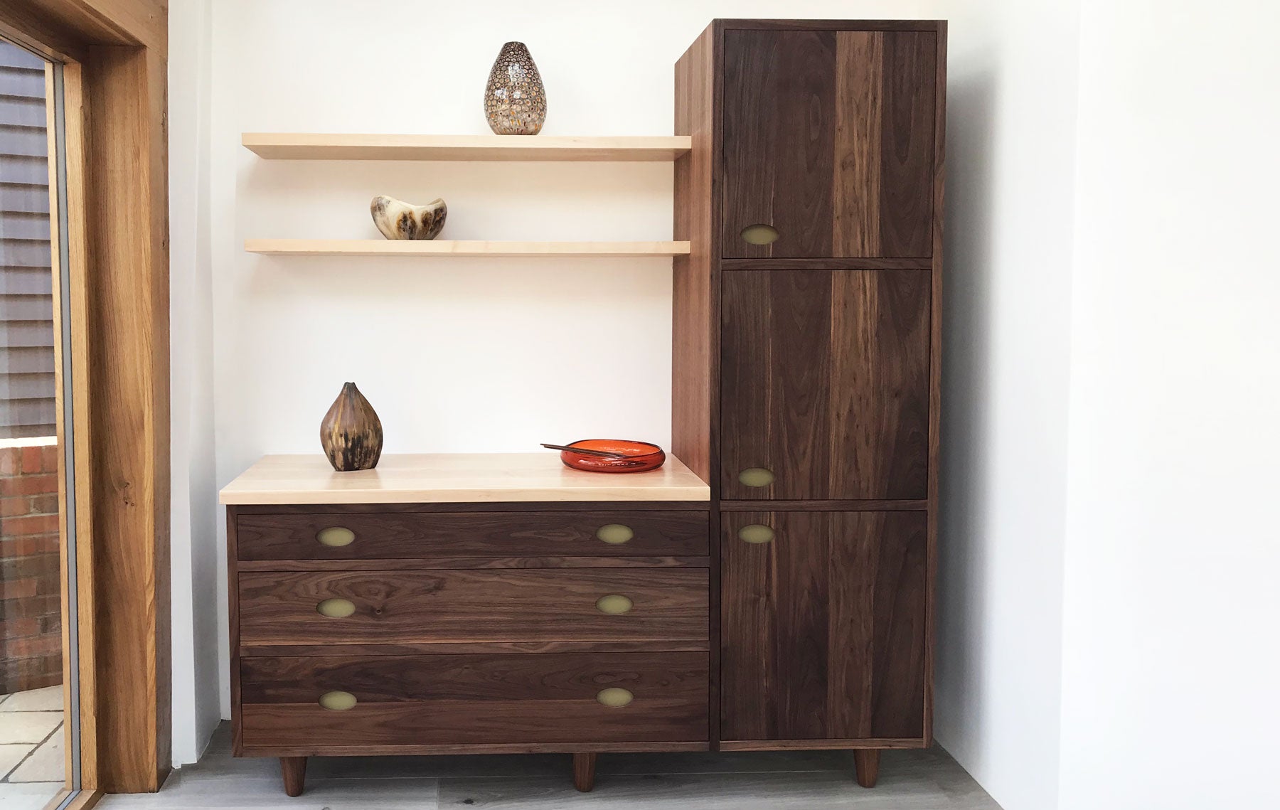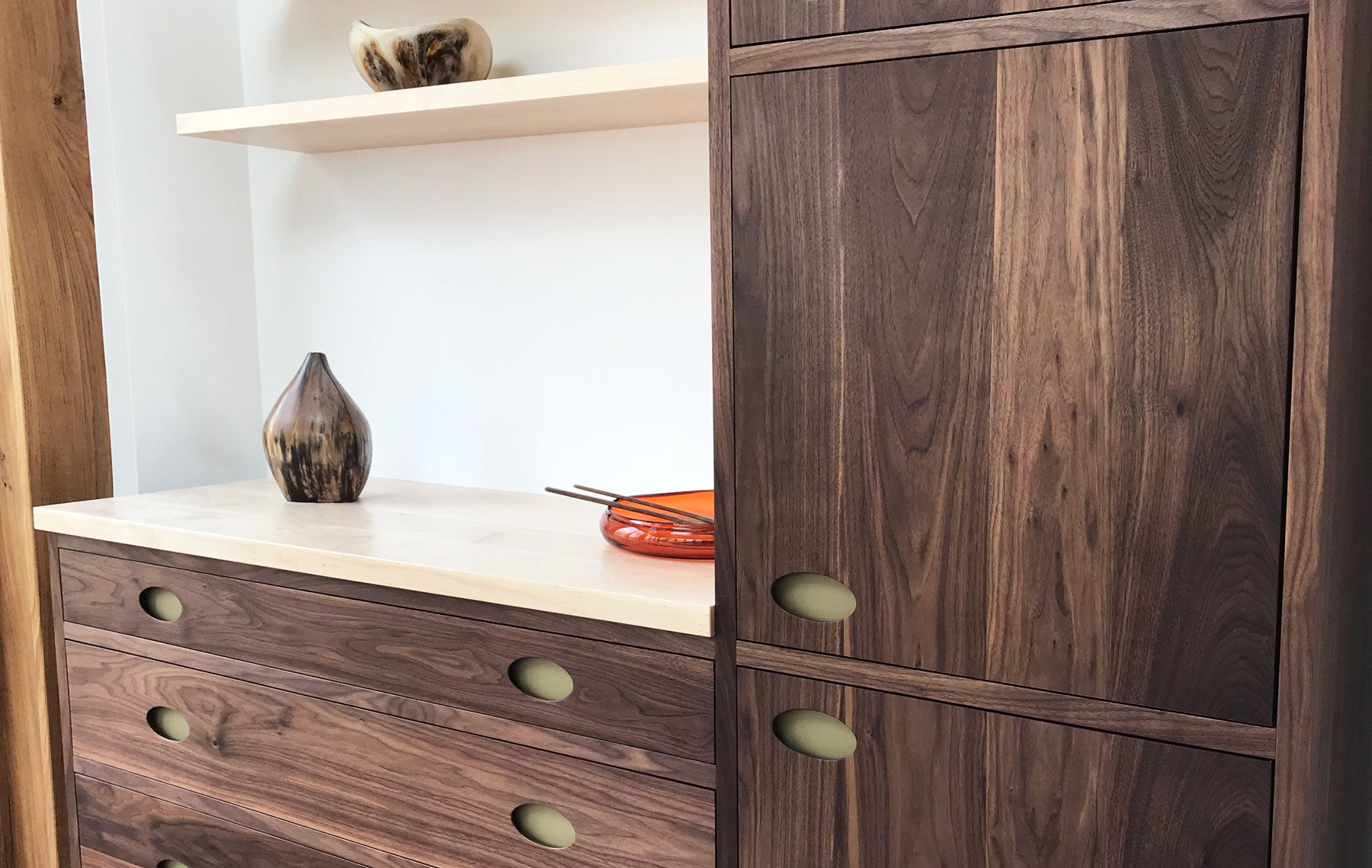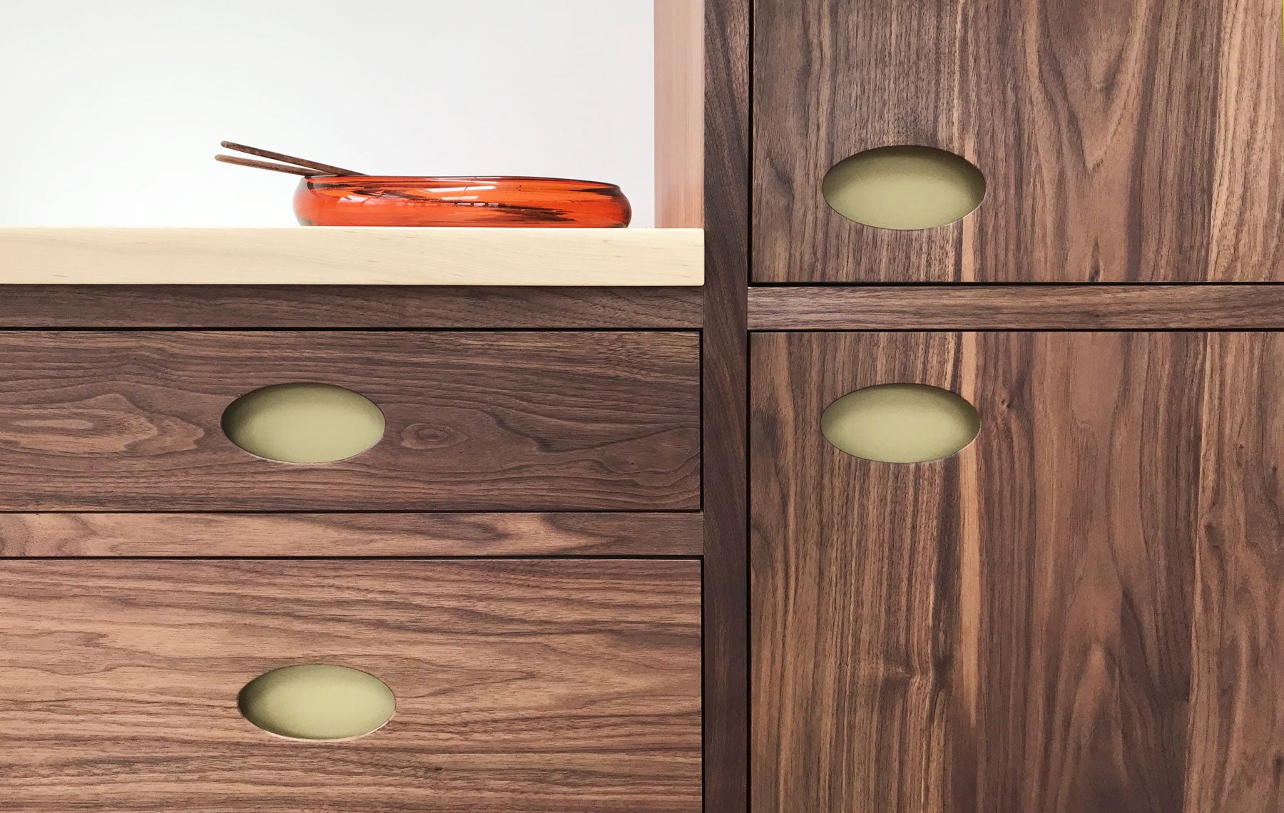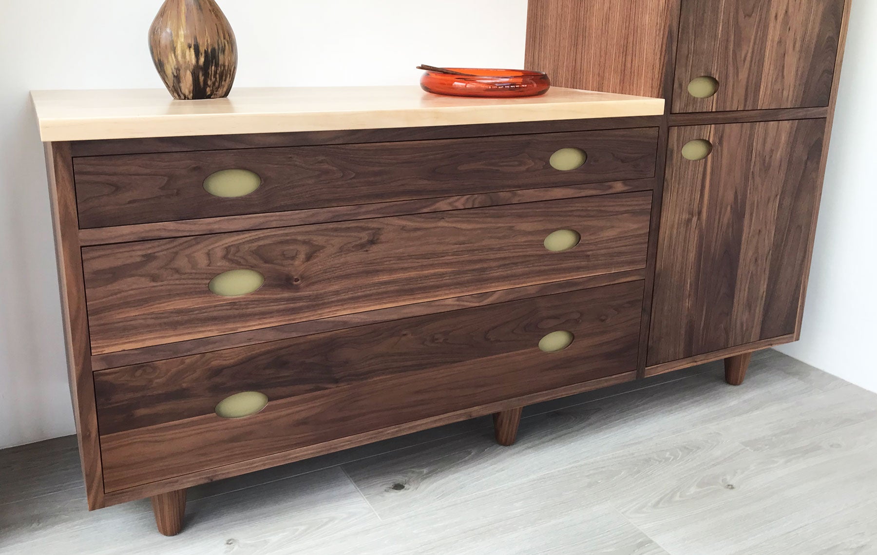 The counter and shelves are lacquered maple; providing a durable work surface as well as a strong contrast to the rich walnut.