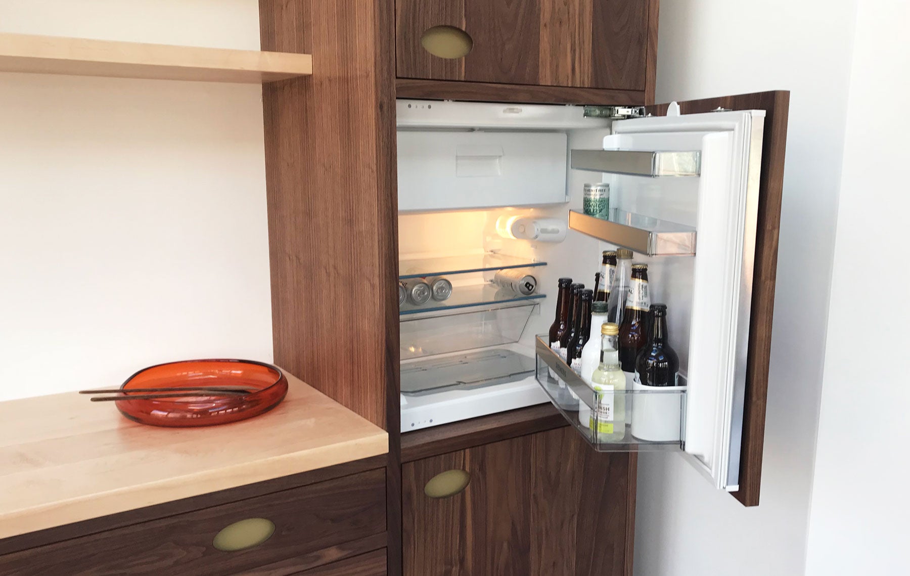 Oval recessed handles backed with olive green add subtle spots of colour to doors and drawer fronts. Behind which is an integrated fridge and wide plywood drawers with internal divisions ensuring every item has it's place.