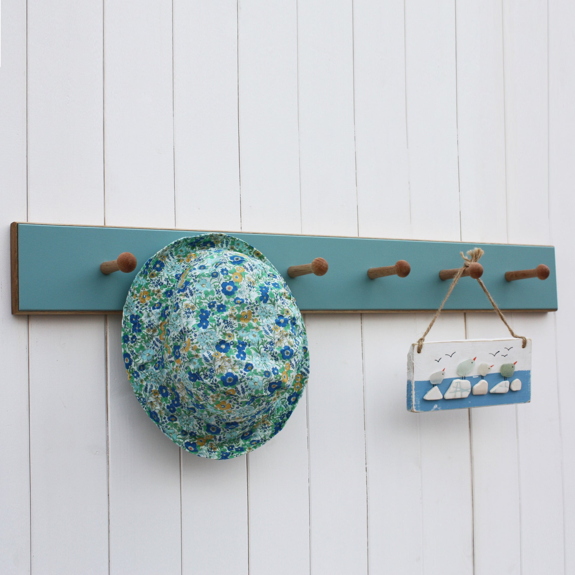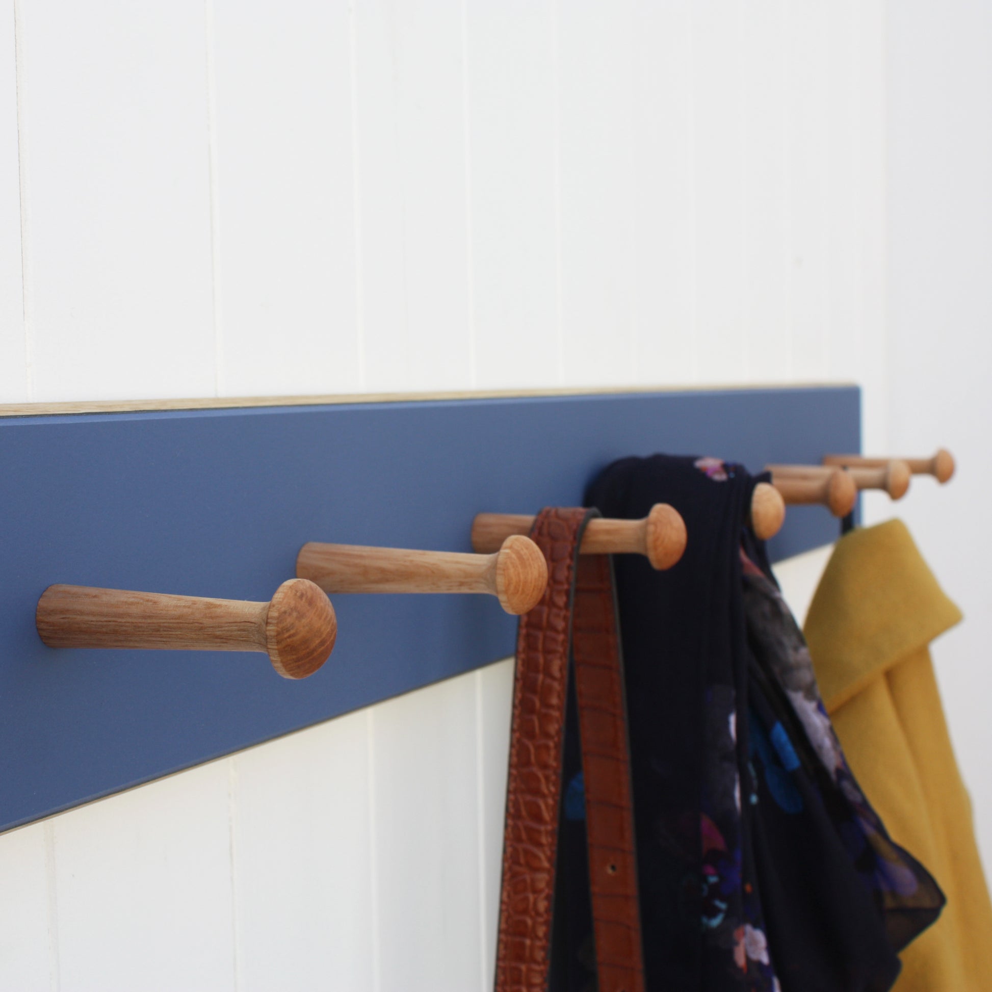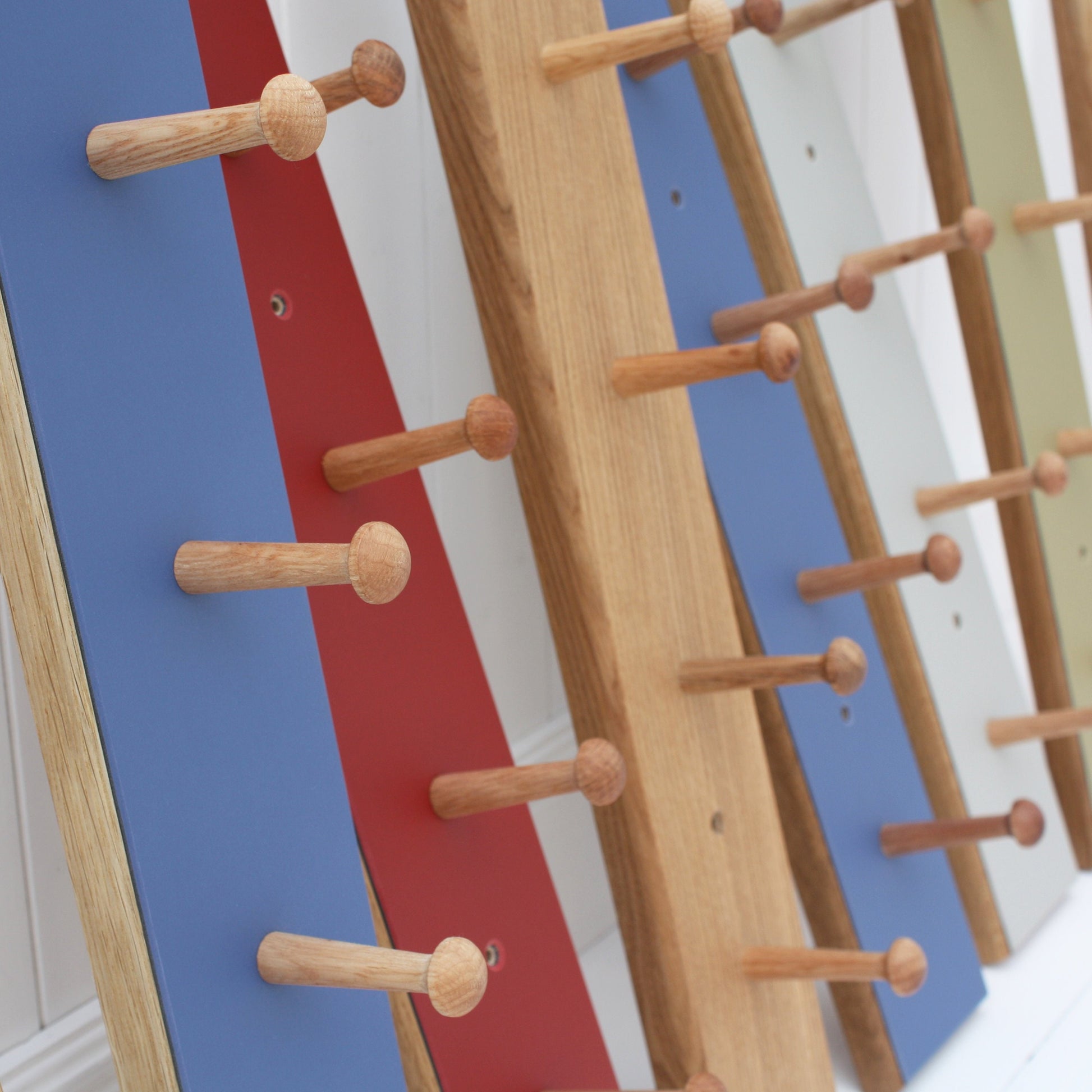 Our handmade oak shaker peg rail with a contemporary twist and splash of colour is as beautiful as it is useful. No home should be without one!